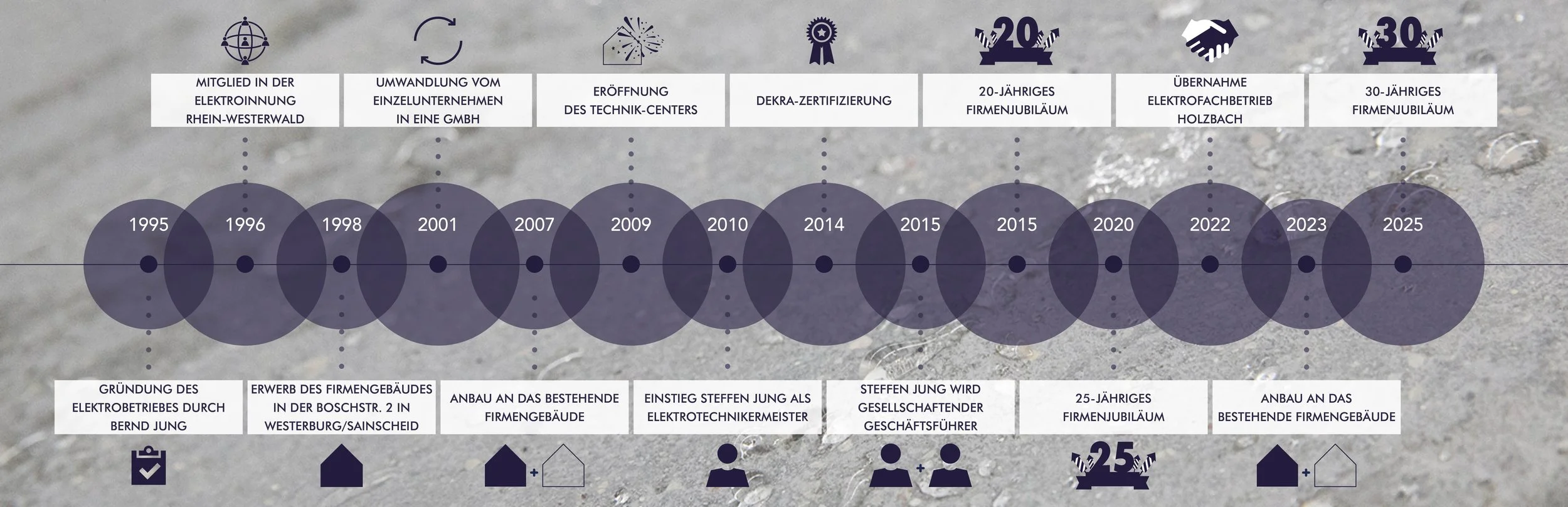 “Leidenschaft für moderne Technik prägt Bernd Jung, der im Jahr 1995 erfolgreich seine Meisterprüfung als Elektroinstallateur im Handwerk abgelegt hat. Damit legte er den Grundstein für ein erfolgreiches Unternehmen, das seitdem kontinuierlich gewachsen ist. ”